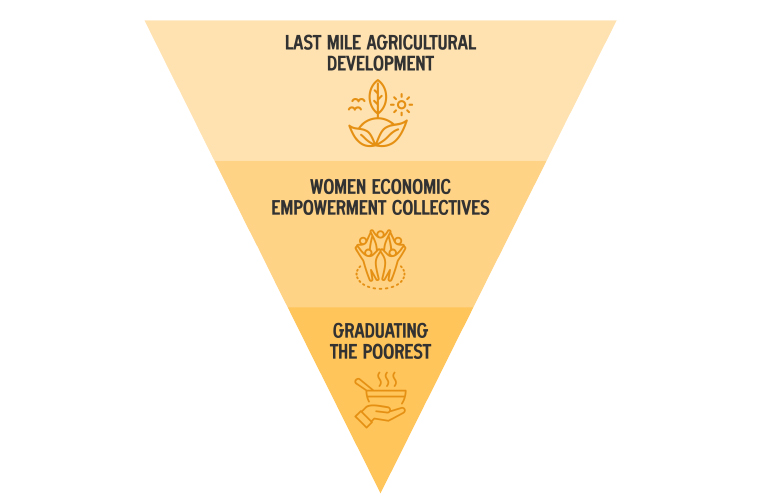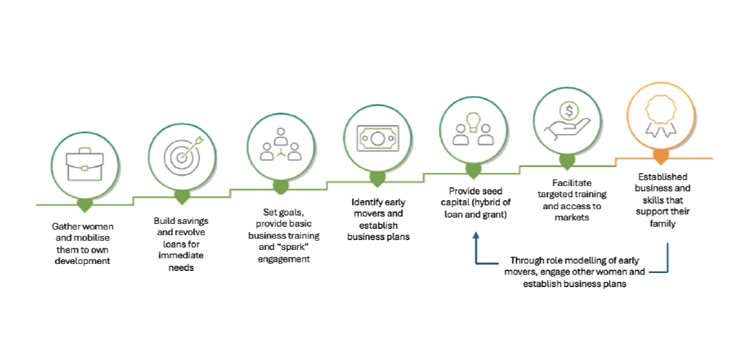For women with limited economic participation: an approach to build savings, access loans from pooled savings, grow income targeted support for diversified small businesses and strengthen confidence.